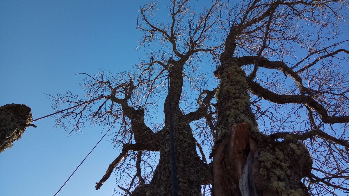 Сделали обрезку дуба в д. Преображенка Батецкого района. Дерево около 1,2 метра в диаметре состояло из более чем 7 основных стволов и имело расколы в нескольких местах. Чтобы сохранить дерево и обеспечить безопасность при нахождении рядом с ним, заказчик решил убрать часть стволов, а на остальных понизить и облегчить крону. Все попилили на дрова, провода и сад остались целы.