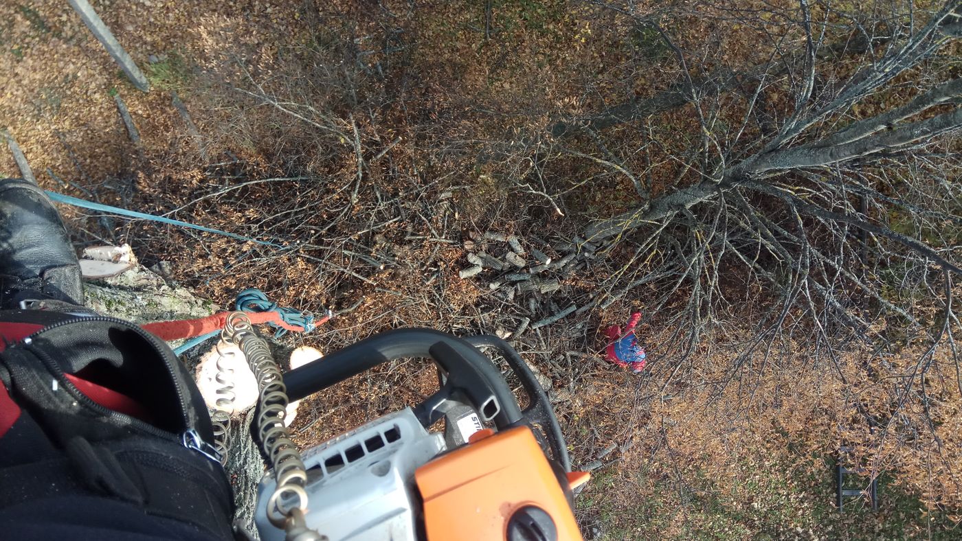 Спил дерева по частям Этот способ применяется арбористом очень часто - даже если нет свободного сектора для валки дерева "с ног", рядом с деревом часто есть прощадка, куда можно сбрасывать небольшие спиленные части дерева. Работы ведутся в кроне дерева, перемещение и страховка при помощи альпинистского снаряжения. Как правило сначала спиливаются ветки, затем ствол пилится частями по 0,5-2 метра и сбрасывается на свободное пространство. |